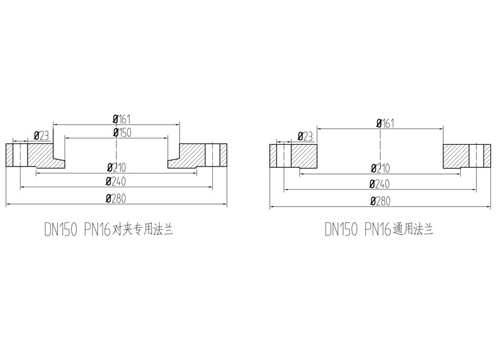 對夾式碟閥使用的法蘭不是普通的平焊法蘭,而是定做的對夾式蝶閥專用法蘭。這是因?yàn)閷A式蝶閥有一個稍大蝶閥通徑的密封面,如果用普通的平焊法蘭與對夾蝶閥連接,法蘭與蝶閥的密封面接觸尺寸較小,會影響密封效果,造成泄漏。所以對夾式蝶閥法蘭造有兩個內(nèi)徑,對夾式蝶閥法蘭外形同不帶頸的承插焊法蘭相似,小內(nèi)徑和通徑差不多大,用于保證蝶閥密封效果。對夾式蝶閥專用法蘭沒有標(biāo)準(zhǔn)號,是按行業(yè)內(nèi)的常規(guī)制作的。對夾式碟閥專用法蘭的其他尺寸與普通平焊法蘭相同,按法蘭標(biāo)準(zhǔn)(比如JB81-94、GB9112、ASME B16.5、HG20592等)執(zhí)行,且螺柱穿過法蘭時保證蝶閥閥體而不與閥體干涉。同時法蘭的小內(nèi)徑尺寸不能過小,應(yīng)保證對應(yīng)的蝶閥閥板能夠完全打開。法蘭的大內(nèi)徑和普通平焊法蘭內(nèi)徑一樣110mm,大內(nèi)徑是用于法蘭與108mm的管道焊接用。全部襯膠的蝶閥選蝶式法蘭也就是承插焊的平焊法蘭,若是金屬密封面的對夾蝶閥可以選用板式平焊法蘭。