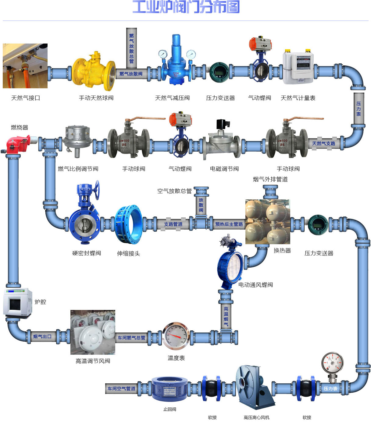 2、供熱系統,包括向工業爐內物料提供熱源的設備系統,如能源介質管道和設備系統、電力輸送系統變壓設備等。在此系統中需要用到的閥門有氣動蝶閥、電動蝶閥、電磁調節閥、手動球閥等。