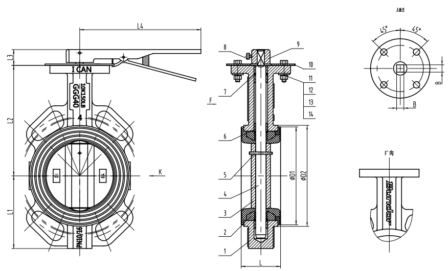 | 尺寸信息 | DN | L | D1 | D2 | L1 | L2 | L3 | L4 | B | ISO 5211上法蘭 | |